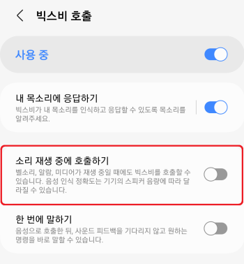 기기 설정 > 애플리케이션 > 빅스비 보이스 > 빅스비 보이스 설정 > 빅스비 호출 > '소리 재생 중에 호출하기' 사용 옵션을 ‘꺼짐’으로 변경해 주세요.