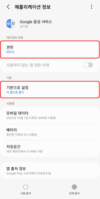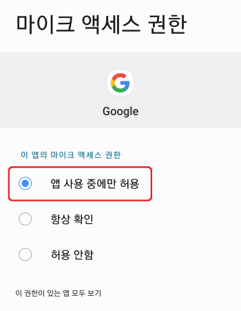 기기 설정 > 애플리케이션 > Google > ‘설치됨’ 상태인지 확인 > 권한 > 마이크 > ‘항상 허용’ 또는 ‘앱 사용 중에만 허용’으로 권한을 허용해 주세요.