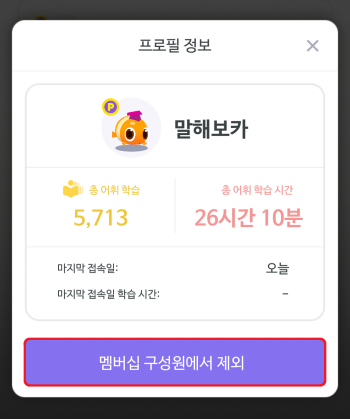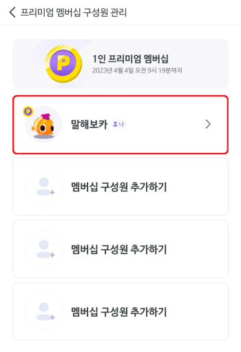 말해보카 앱 왼쪽 위 三(설정) 버튼 > [프리미엄 멤버십 구성원 관리] 탭 > 추가된 멤버의 프로필을 눌러 [멤버십 구성원에서 제외]를 통해 멤버를 제외할 수 있어요.
