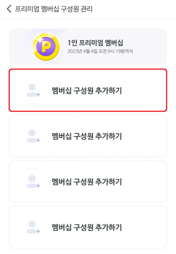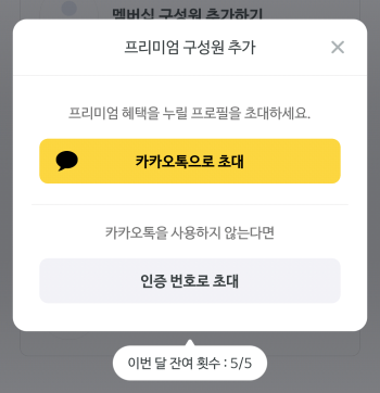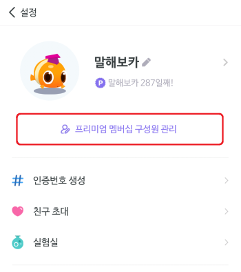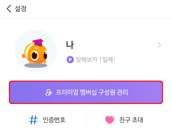 말해보카 앱 왼쪽 위 三(설정) 버튼 > [프리미엄 멤버십 구성원 관리] 탭 > [멤버십 구성원 추가하기] > 카카오톡/인증 번호 중 원하는 방법으로 멤버를 초대할 수 있어요. 자세한 방법은 여기 내용을 참고해 주세요.