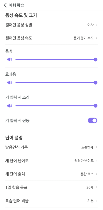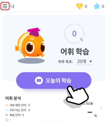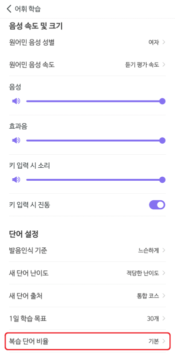 ※ '새로운 어휘'가 없다면, 말해보카 앱 설정 > 어휘 학습 > 복습 단어 비율이 [복습 위주로 하기 / 복습만 하기]로 되어 있는 지 확인 후, [기본]으로 변경해 주세요.