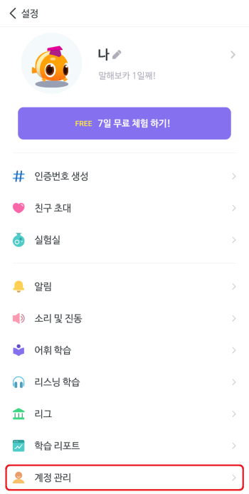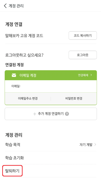 말해보카 앱 왼쪽 위 三(설정) 버튼 > 계정 관리 > 탈퇴하기
